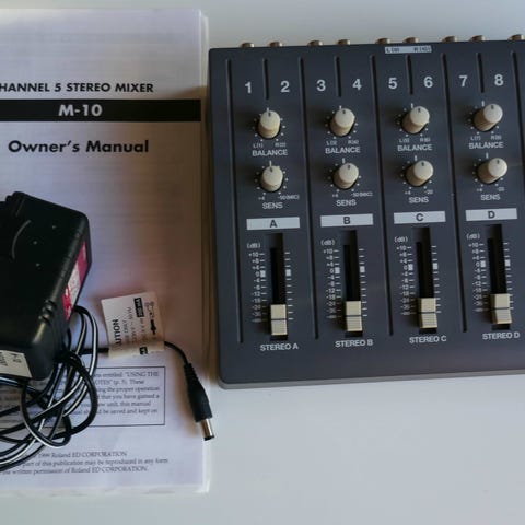 Behringer Xenyx 1002 mixerbord med flera kanaler och reglar för volym och EQ. Nätadapter ingår.