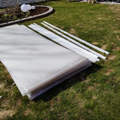 Diverse tillbehör/profiler finns men ingen garanti att allt är komplett. Måtten är ungefärliga. Troligtvis inköpt på Skånska byggvaror. Nytt men har säkert stått några år, har aldrig varit monterat.