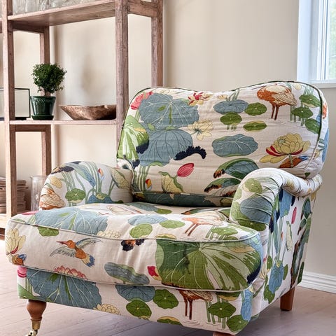 Fotpall med svarvade ben som också kan användas som extra bord. Omklädd i exklusiv sammet ”Japanese Garden” från Linwood. En vacker och praktisk liten färgklick i vardagsrummet. Direkt från tapetserarverkstan, helt oanvänd efter omklädsel!