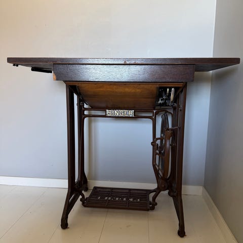 Singer symaskin 50-tal, monterad i ett teakbord. Elektrisk. Bordet har infälld maskin, förvaring i lådor och en lös skiva för extra arbetsyta. Funkade sist jag kollade. Lite färgstänk på ena gaveln.
