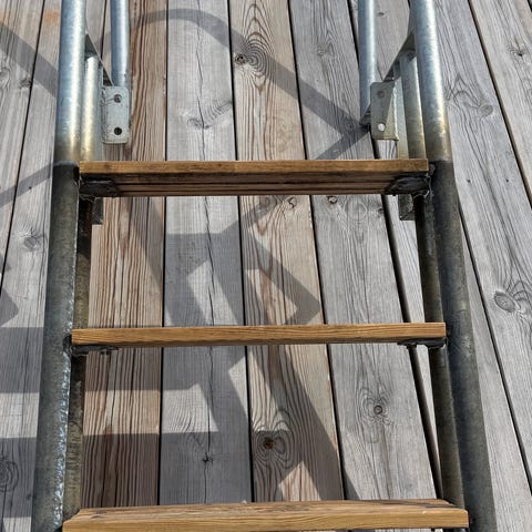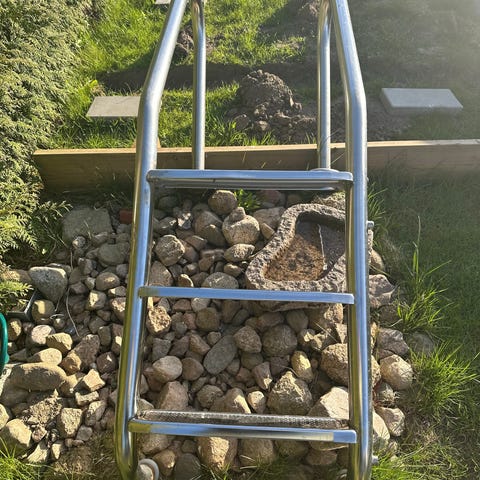 Rostfri badstege med fyra steg och rundade handtag upptill. Fästen finns.