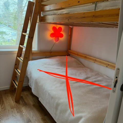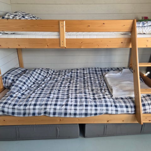 Mycket praktisk möbel för tonårsrummet. Våningssäng i massiv furu med bädd upptill och soffa undertill med utdragbar bädd 136 cm bred för 2 personer. Inbyggd stege, liten skrivbordsskiva med hyllor på sidan. Madrass med madrasskydd ingår. Nypris drygt 6.000. Hämtas nedmonterad i Mariefred el Huddinge.