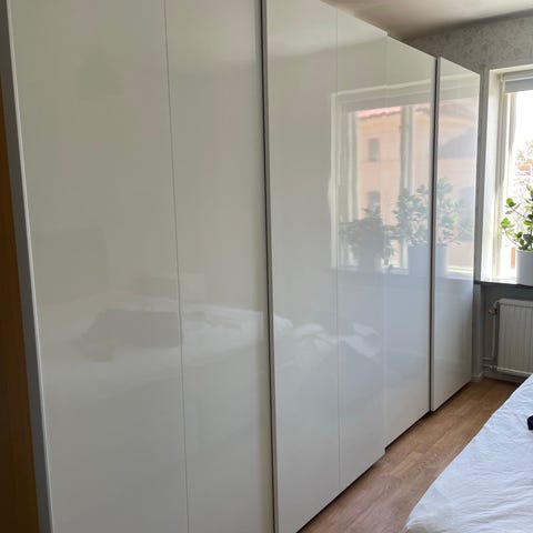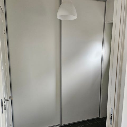 Skjutdörrar med skenor. De 4 dörrarna har tonade speglar. Måtten är 302 cm bred och 348 cm hög. Mycket bra skick.