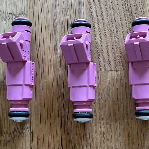 Bränsleinsprutare/spridare till Volvo, brun plastkropp med svart Viton O-ringar och genomskinlig skyddshylsa i änden.