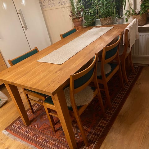 Stilrent matbord i trä med fyra stolar, sitsar i röd- och vitrandigt tyg. Bordet har kraftigt underrede och extra skiva för att kunna göra bordet större.