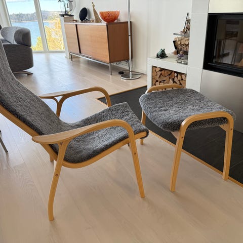 Swedese Lamino fåtölj och fotpall oljad ek/fårskinn