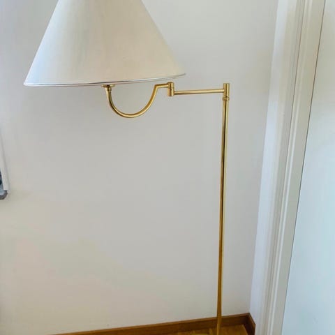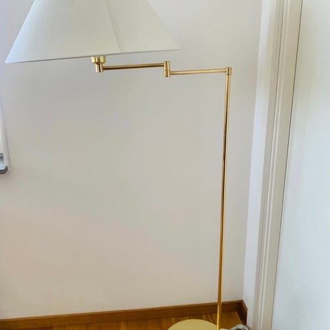 Säljer en unik och ovanlig golvlampa i klassisk art déco-stil från 1970-talet. Lampan är tillverkad i mässingspläterat stål med stilrena svarta detaljer som ger ett exklusivt och tidlöst uttryck.