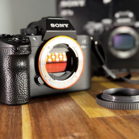 Sony A7 III systemkamera med zoomobjektiv, svart hus med vinklingsbar skärm. Objektivet har motljusskydd och kameran har rejält grepp och flera reglage upptill.