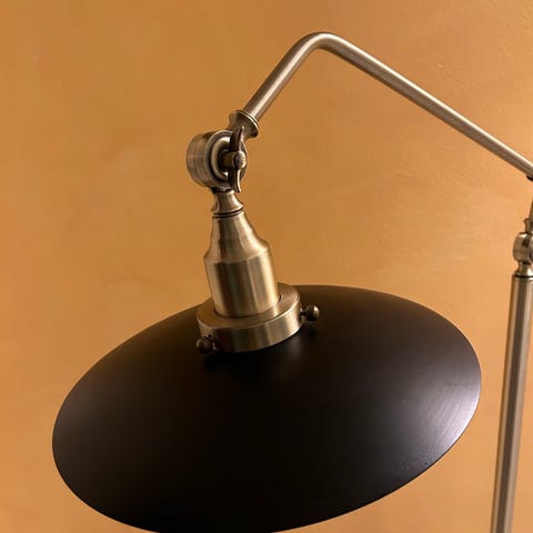Säljes en snygg och stilren golvlampa i mässing med vit lampskärm, designad av Fa F. Facklam. Lampan har en justerbar arm som gör det enkelt att rikta ljuset efter behov – perfekt som läslampa eller stämningsbelysning.