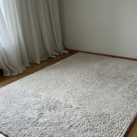 Ryamatta från Ellos i vit med mörkgrått rutmönster. Använt skick. Finns en röd liten färgfläck, se bild 1. 160x230.