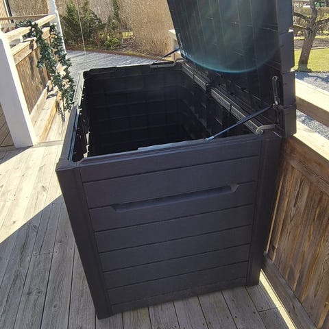Stor svart förvaringslåda i plast som passar bra på altan eller balkong. Locket är gångjärnsförsett och lådan har handtag på sidorna för enkel förflyttning.