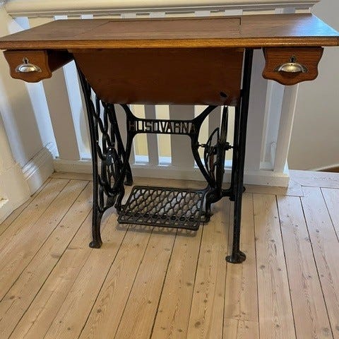 Har stått oanvänd i många år. Vet ej om symaskinen fungerar.