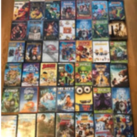 Stor flyttkartong fylld med blandade DVD-filmer, många tecknade titlar som Shrek, Tom & Jerry m.m. Flera olika fodraltyper och några lösa skivor i plastfickor i lådan.