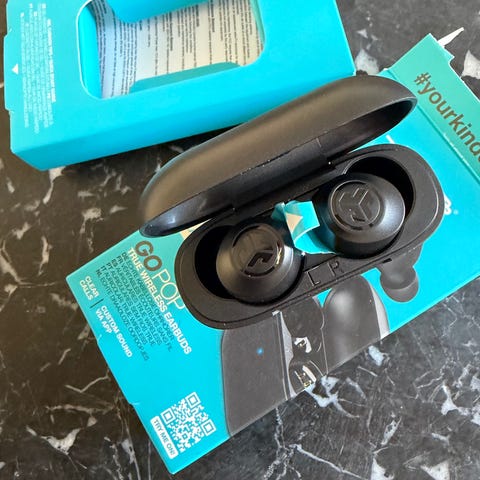 JLab Go Pop true wireless in-ear hörlurar i blått med laddningsetui. Smidig liten ask och öronproppar som sitter bra i örat.