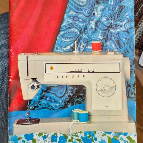 Singer 438K symaskin i vit färg med flera inställningar för stygn på framsidan. Har inbyggd lampa, fotpedal och avtagbar del för friarmssömnad. Tung och stadig.