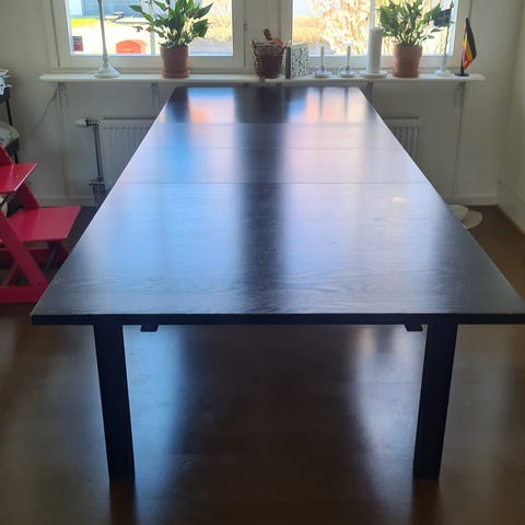 Utdragbart bord som enkelt förlängs med iläggsskiva (förvaras under bordet) och rymmer 4–6 personer.