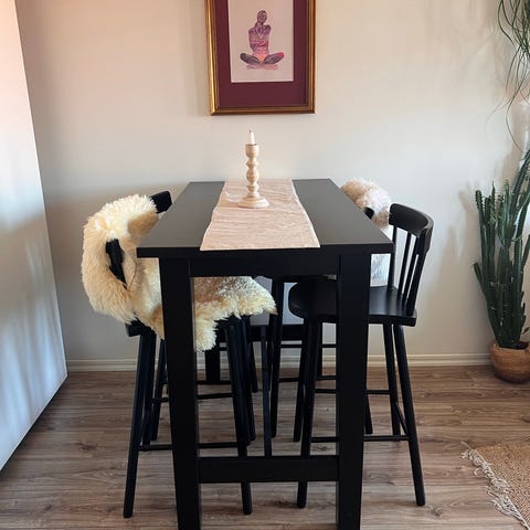 Små repor finns på bordsskivan och några fläckar på stoltyget (se bilder), tyget kan köras i maskin eller enkelt bytas genom att skruva loss sitsen.