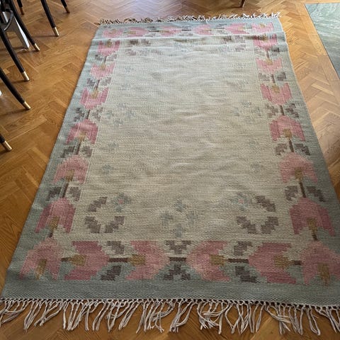 Fin gångmatta i blått, naturvit och rosa med geometriskt mönster. Passar bra i hall eller kök där du vill ha en längre matta