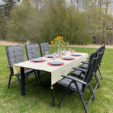 Säljer en utemöbler bestående av sex stycken stolar som är fällbara steglöst. Dynor mycket gott skick ingår. Bord i stålkonstruktion med stenkompositskiva.