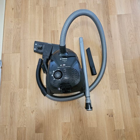 Bosch PAS 11-21 grovdammsugare med slang och munstycke. Har bärhandtag upptill och stor behållare som är lätt att tömma.