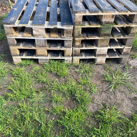 7 stycken Träpallar staplade på varandra, standard EPAL-EUR-pallstorlek. Bra för förvaring, byggprojekt eller som grund till egna möbelbyggen.