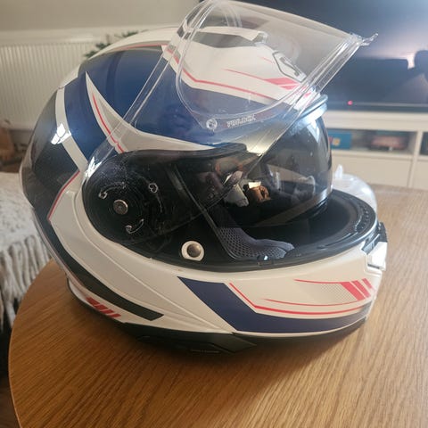 BMW integralhjälm i stl L med visir och klassiska M-färger runt om. Tillhörande BMW motorcykeljacka i stl L med dragkedja fram och färgpaneler i vitt, blått och rött. Bmw mc vantar storlek 9-9,5.