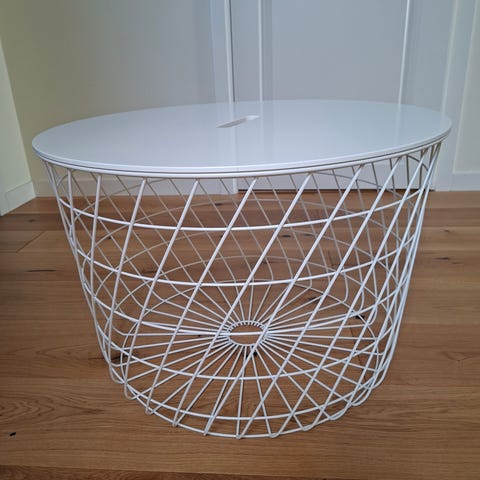 Vitt soffbord från IKEA med rund skiva och korgunderrede i metall, diameter ca 61, höjd ca 42 cm. Korgen/underredet är utan anmärkning men bordsskivan har sett bättre dagar, dock inget som stör funktionen. Skulle kunna bytas mot tex en rund bricka.