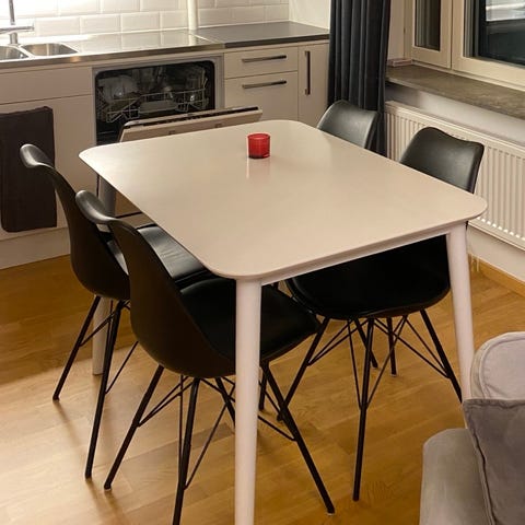 Fina naturfärgade matstolar i teddy material med svarta stålben. Nypris 899kr styck, nu 2000kr för alla 6