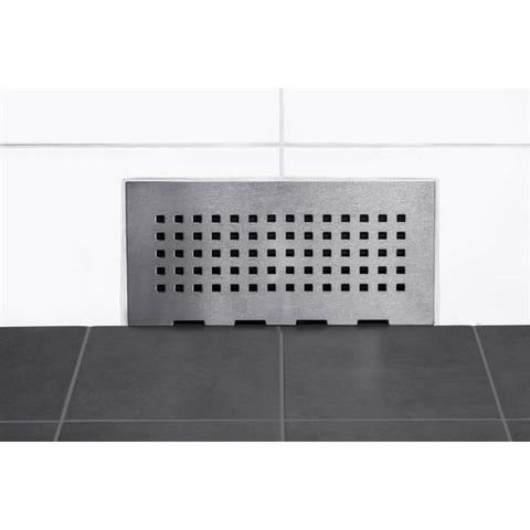 Svart duschhylla från Tebo, modell Shower Shelf Tile In för hörnmontering. Metallhylla med slitsar och hål i botten för avrinning.