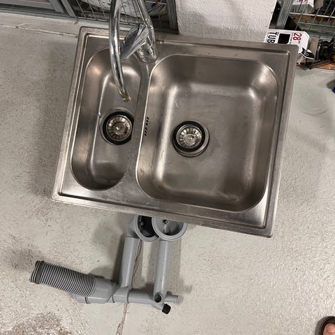 Rostfri diskbänk med dubbelho monterad på enkel trästomme, passar bra som utekök eller arbetsbänk. Har blandare, underhylla i trä och uppbyggd ram ovanför för upphängning eller tak. Vattenslang kan kopplas på till blandaren.