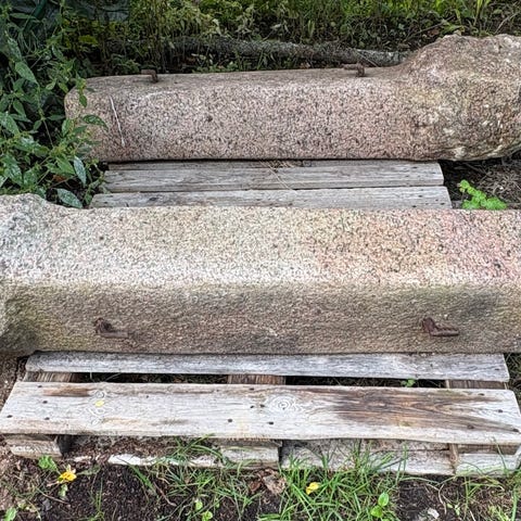 Stora granitblock i olika längder och tjocklekar, ligger staplade på pallar. Flera block har grovhuggna kanter och spår efter kilning, bra som t.ex. mur- eller kantsten.