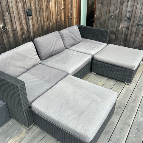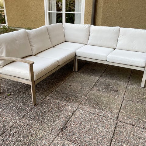 Lyxig hörnsoffa utomhus med trästomme och ljusa dynor