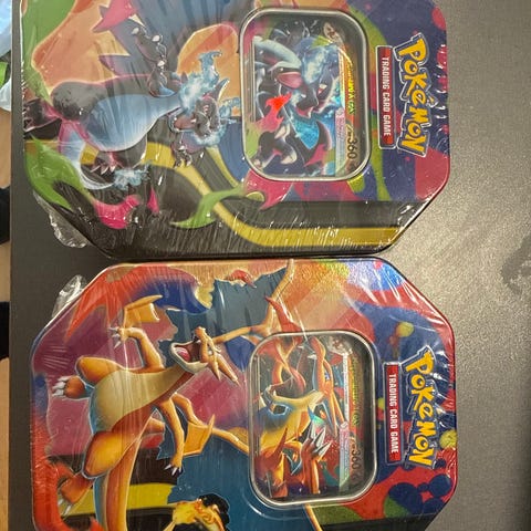 Stor bunt Pokémonkort i en Pokémon-plåtlåda, blandat med vanliga kort och foil/rare i plastfickor. Förvaras i lådan som syns på bilderna, redo för ny samlare att gå igenom.