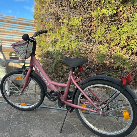 Rosa barncykel med 20" hjul och kedjeskydd. Har pakethållare bak, skärmar och stödben.
