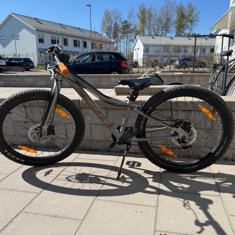Scott barncykel med 24" hjul i gul färg och svart detaljer. Har framgaffel med dämpning, skivbromsar och 8 växlar bak.