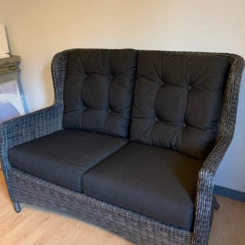 Lätta svarta utemöbler som kan stå ute i alla väder i bra skick i mycket bra skick. Gråa tjocka dynor i mycket bra skick.