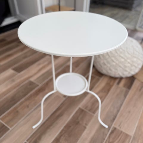Fint sidobord. Underrede i stål och löst sittande marmorskiva. Den är rejält tung så bordet är stabilt trots att den är avtagbar.
