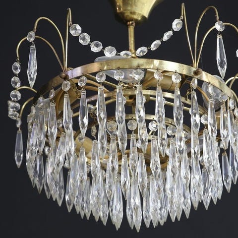 Otroligt vacker äldre kristallkrona/plafond med alla sina prismor kvar. Precis rengjord så den verkligen strålar! Funkar perfekt. Många fina detaljer.