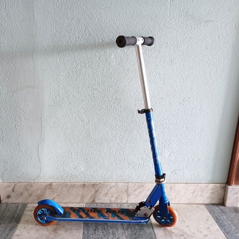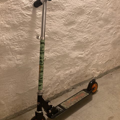 Orange sparkcykel från Pinepeak med stora luftdäck. Har handbroms fram och rejält fotstöd med grepptejp.