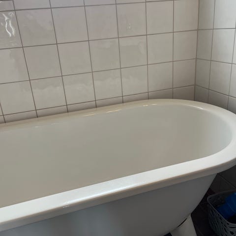 Fristående vitt badkar på ben, klassisk modell med avrundade kanter och bottenventil i mitten. Badkaret är i bra skick med lite små repor.