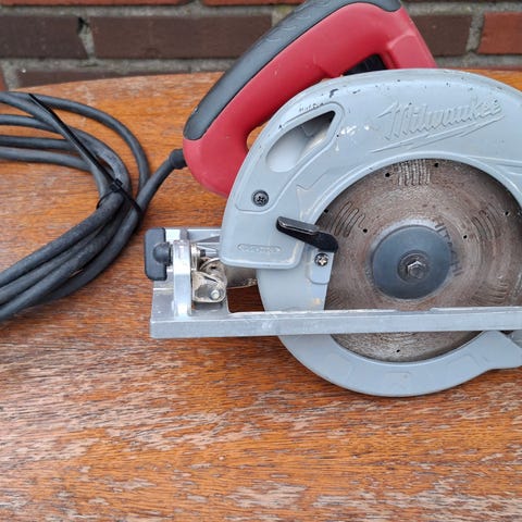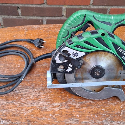Bosch PKS cirkelsåg med grön kropp och svart front. Har justerbart anhåll och lång sladd med stickkontakt.