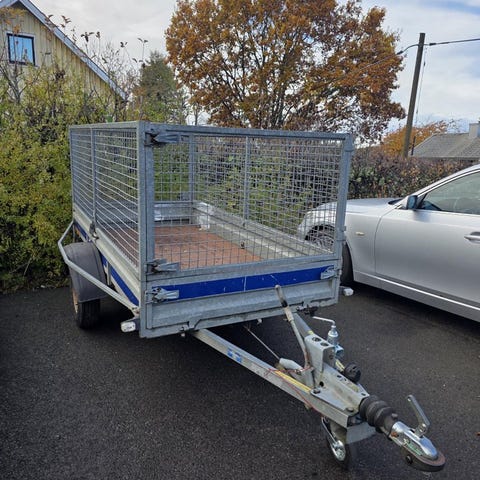 PROF släpvagn med gallergrindar och blå skärmar, bra för att frakta skräp eller trädgårdsgrejer. Enaxlad vagn med dragstång fram och standardkoppling mot bil.
