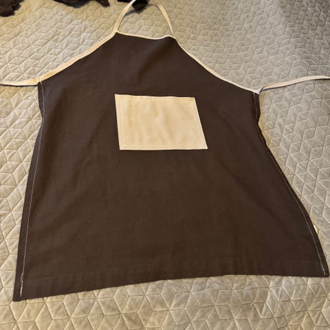 Förkläde från Åhléns, modell Dennis, i grått med smala ränder och stor ficka fram. Justerbart band i halsen och knytband i midjan, 100 % bomull.