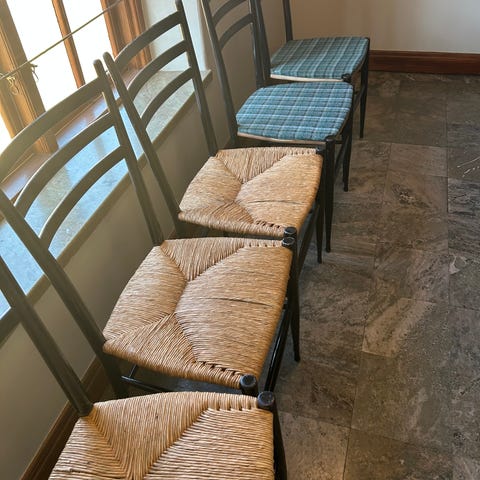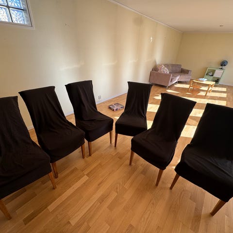 Trästolar 6 st - några har trasig sits och är skeva.