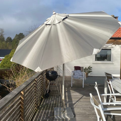 Hängparasoll i grå/lila (solen) ton för uteplats. Följer med tunga granitplattor som fot och parasollet har böjbar stång och enkel öppningsmekanism.