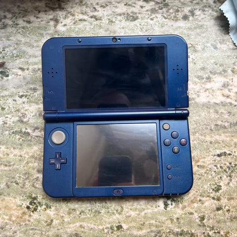 Nintendo 3DS i turkos färg med dubbla skärmar och styrspak. Har inbyggda kameror och volymreglage på sidan. Skal, sd kort 2GB och laddare ingår