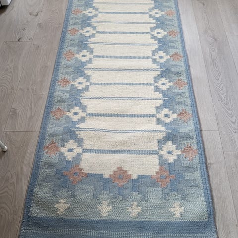 Röllakanmatta med vävd bård i rosa och grå toner runt kanten. Har fransar på kortsidorna och diskret signatur i ett hörn.