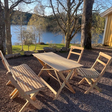 Adirondack, loungemöbler, trädgårdsmöbler, utemöbler, fotpall, bord, tryckimpregnerat, altan, veranda, sommarstuga