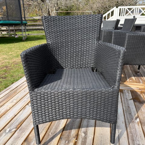Svart stol i konstrotting för uteplats eller altan. Har armstöd och hög rygg med flätad design runt om. Stabila och helt ok skick.