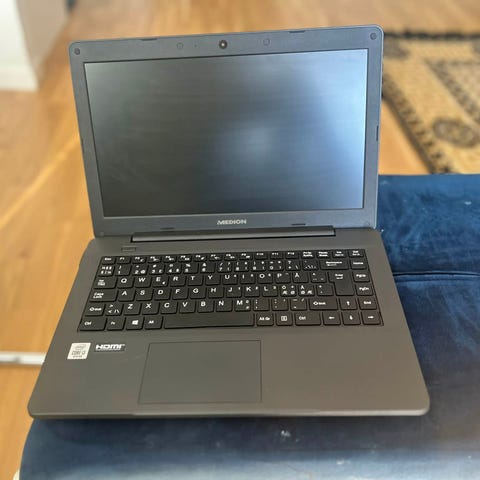 MSI 14” laptop i svart med fullstor tangentbordslayout. Har pekplatta under tangentbordet och flera portar på sidorna för anslutningar.